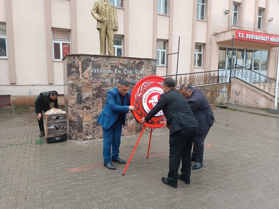 Doğubayazıt Muhtarlar Dernek Başkanı Gündüz Kılıç'ın Atatürk Anıtı'na çelenk sunumundan sonra tören saygı duruşu ve İstiklal Marşı'nın okunması ile devam etti.
