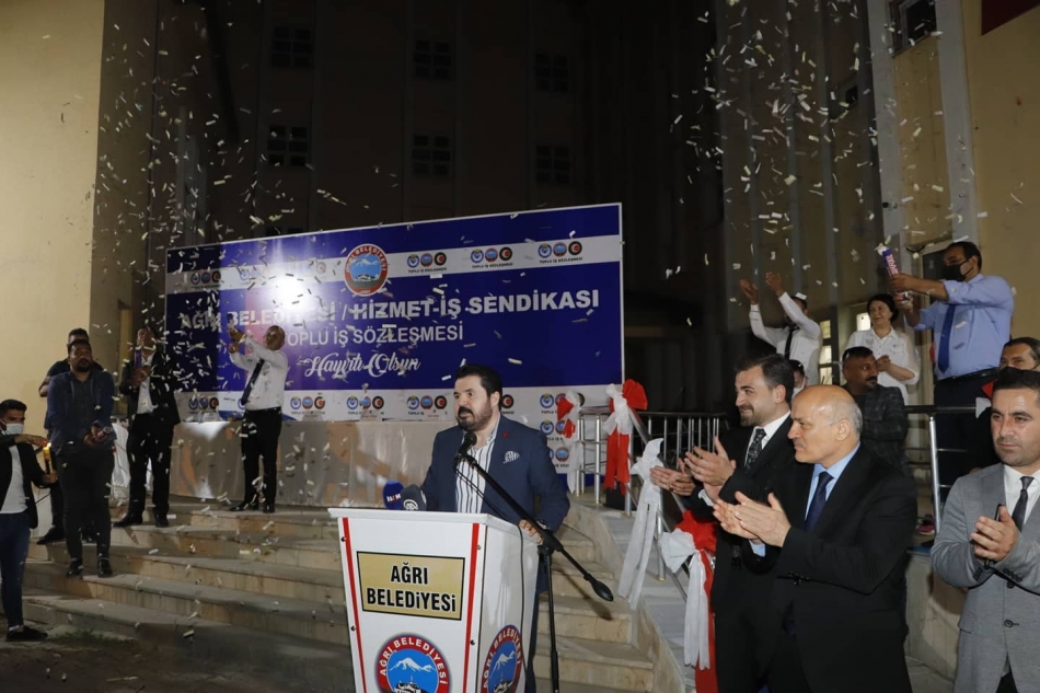 Ağrı Belediyesi ile yetkili sendika Hizmet-İş Sendikası arasında belediye binası önünde düzenlenen törenle toplu iş sözleşmesi imzalandı.