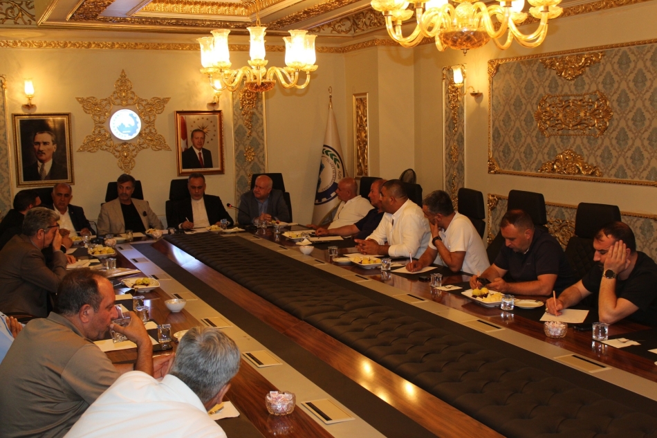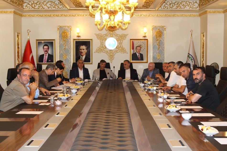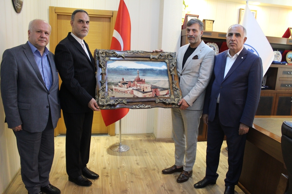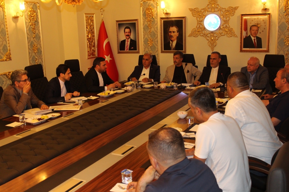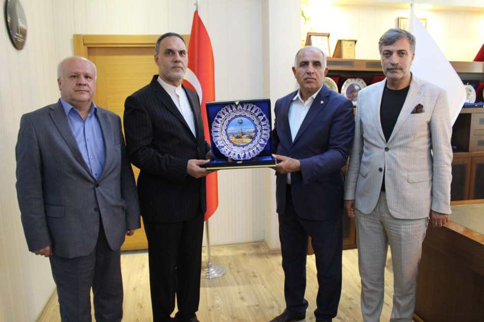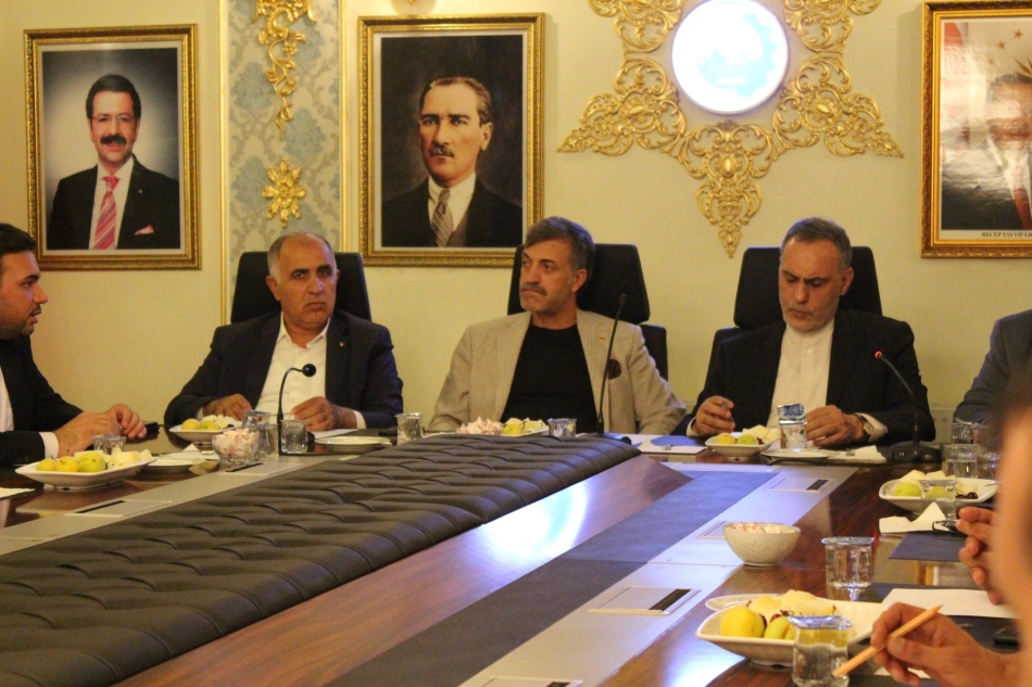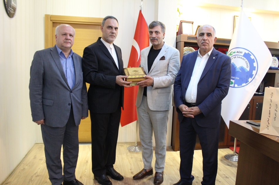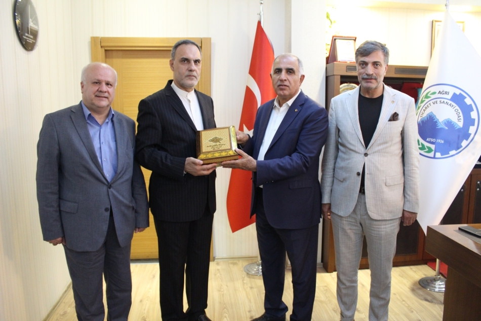 Ağrı Ticaret ve Sanayi Odası toplantı salonunda; İran İslam Cumhuriyeti Ankara Büyükelçisi Dr. Mohammad Hassan Habibollah Zadeh, Erzurum Başkonsolosu Mohammad Ebrahimi, Doğubayazıt Ticaret Oda Başkanı Cemal Can, Ağrı Ticaret Oda Başkanı Saim Alpaslan ve yönetim kurulu üyeleri, Ağrı’da Ticaretin geliştirilmesi hakkında bir toplantı yaptılar.
