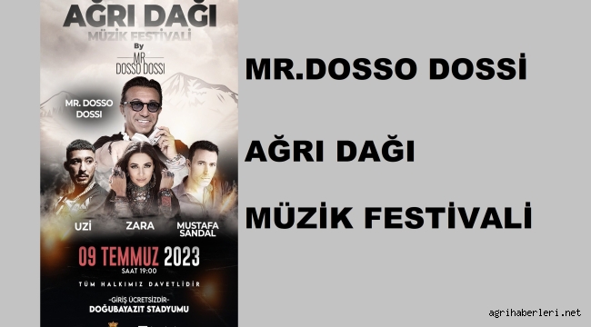 MR.DOSSO DOSSİ; Hikmet Eraslan, tarafından organize edilen “MR.DOSSO DOSSİ AĞRI DAĞI MÜZİK FESTİVALİ” 09.07.2023 günü saat 19.00 da Doğubayazıt Doç. Dr. Yaşar Eryılmaz Şehir Stadyumunda yapılacaktır.