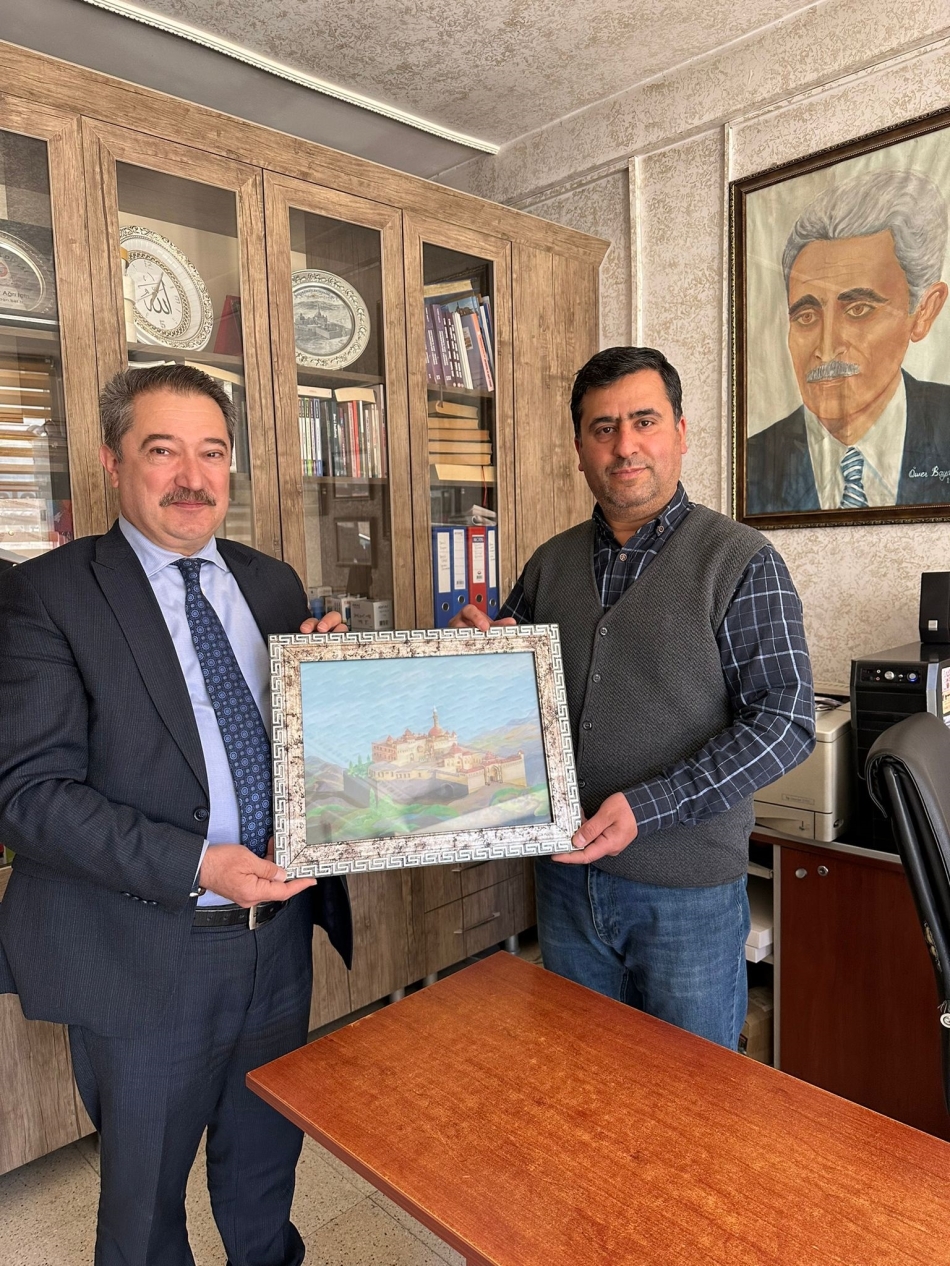 Narinkale Gazetesi sahibi Erhan Baydar, AK Parti Ağrı Milletvekili Adayı M. Ali Bilgili’ ye ziyaret anısına yağlı boya yapımı bir İshakpaşa Sarayı fotoğrafı hediye etti.