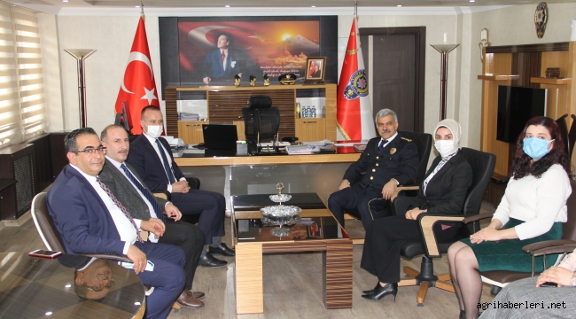 Ağrı İl Milli Eğitim Müdürü Mehmet Faruk Tekin, beraberindeki heyet ile birlikte Türk Polis Teşkilatı’nın 176. Kuruluş Yıl Dönümü ve 10 Nisan Polis Haftası dolayısıyla İl Emniyet Müdürü Nihat Özen’i makamında ziyaret etti. Tüm emniyet teşkilatının 10 Nisan Polis Haftası’nı kutlayan İl Milli Eğitim Müdürü Tekin, “Polis teşkilatının kuruluşundan bugüne kadar, ülkemizin huzur ve güvenliğini sağlamayı, vatandaşın can ve mal güvenliği ile namusunu korumayı, yardıma muhtaç insanlara yardım elini uzatan, ülkesi ve milletiyle bölünmez bütünlüğünü hedef alan tehdit ve tehlikelere karşı mücadele etmeyi kendisine görev edinen ve 176. kuruluş yıl dönümüne ulaşan Türk polis teşkilatı mensuplarının bu anlamlı gününü kutluyor, görevleri sırasında hayatlarını kaybeden aziz şehitlerimize Allah'tan rahmet, gazilerimize şükranlarımı diliyorum. Halen görevlerini sürdüren polis teşkilatı mensuplarına aileleriyle birlikte sağlık, başarı ve mutluluklar diliyorum”dedi.
