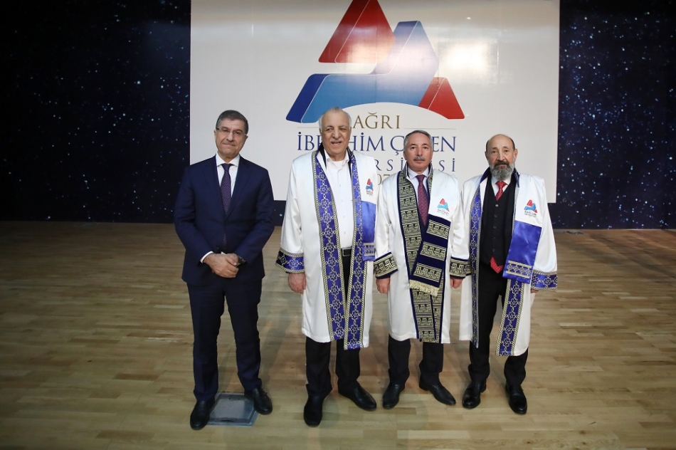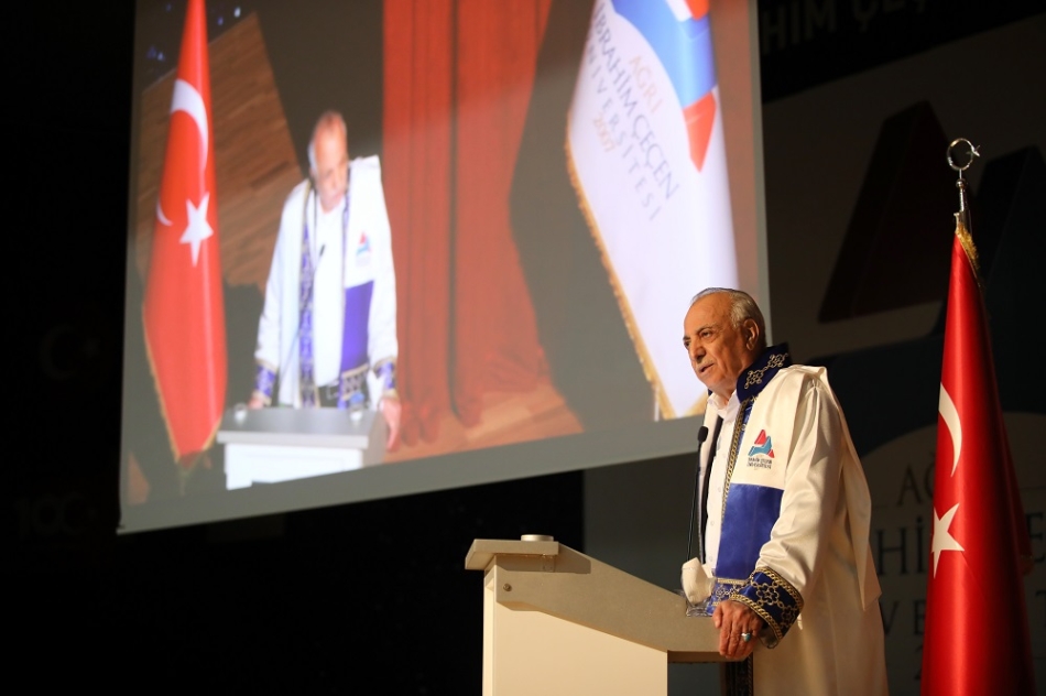 AİÇÜ’nün henüz 17 yıllık bir geçmişe sahip olmasına karşın Türkiye’nin önemli eğitim kurumları arasında yer aldığını belirten Prof. Dr. Karabulut, “Üniversitemizin bu yükselişinde büyük katkıları olan ilk Fahri Doktora unvanını verdiğimiz ve ismini onurla taşıdığımız İbrahim Çeçen beye ve her zaman desteğini aldığımız İbrahim Çeçen Vakfı’na teşekkür ediyorum. Bugün ise bu topraklardan çıkmış iki güzel insan, iki hayırsever iş insanı, ‘İnsanı yaşat ki devlet yaşasın’ düsturu çerçevesinde eğitim gönüllüsü büyüğümüz Doğubayazıt Ahmed-i Hani Yerleşkemizi yaptıran Sayın Abdolbari Goozal ile Eleşkirt Yerleşkemizi yaptıran Sayın Celal Oruç beye aramızdalar. Kendilerine tekrar hoş geldiniz diyor, saygı ve şükranlarımı sunuyorum. ‘Bilimde, teknolojide, sanatta, sporda, insanlık veya ülke hizmetinde üstün başarı gösteren ve önemli katkılar sağlayan kişilere verilen’ Fahri Doktora unvanını kıymetli hayırsever iş insanı hemşerilerimiz Sayın Goozal’a ve Sayın Oruç’a tevdi etmekten dolayı mutlu olduğumu belirtmek istiyorum. Sayın Çeçen’e Sayın Goozal’a ve Sayın Oruç’a, Üniversitemiz ailesi adına şükranlarımı sunuyorum. Yine her zaman iş birliği içinde çalıştığımız Kıymetli Valimiz Mustafa Koç’a ve ilimizin kıymetli protokol üyelerine teşekkür ediyorum” ifadelerini kullandı.