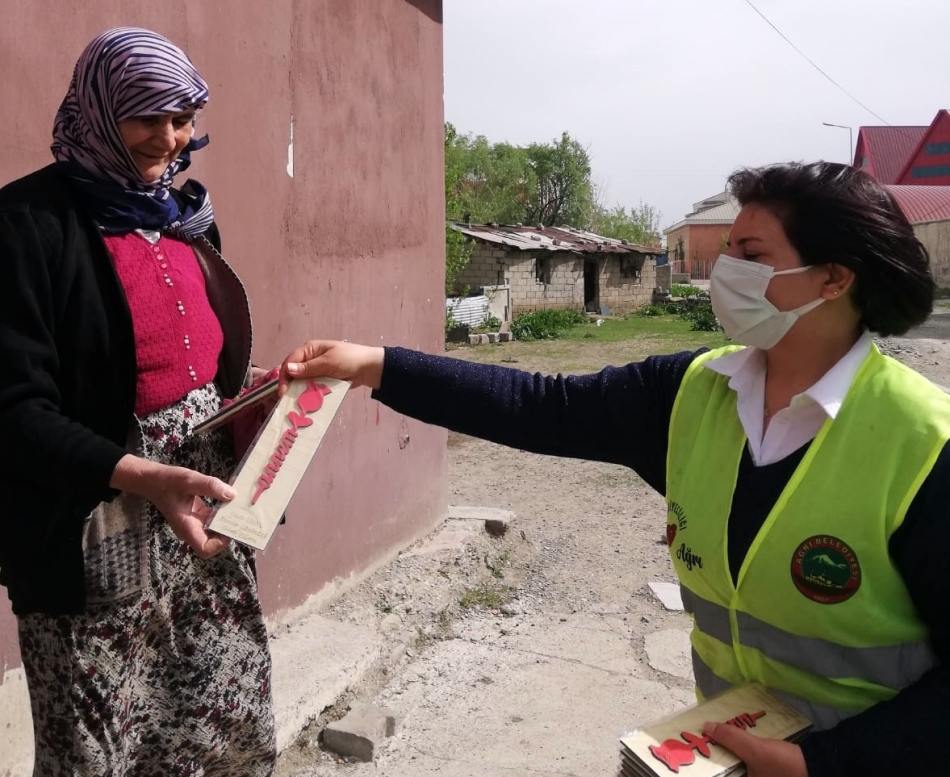 Ağrı Belediyesi çalışanları, annelere içerisinde ahşap üzerine işlenmiş gül, maske ve iyi dilek mektubunun olduğu hediye paketlerini evleri ziyaret ederek dağıttı.