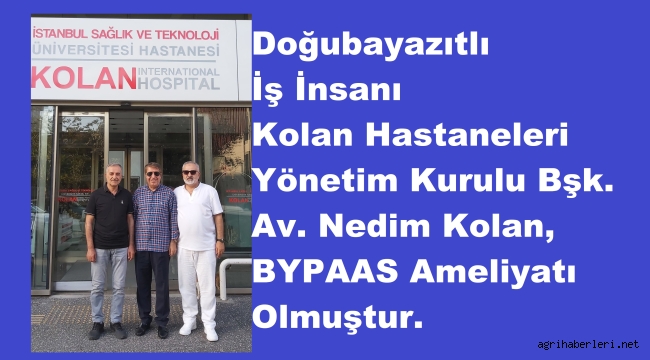 Doğubayazıtlı İş İnsanı Kolan Hastaneleri Yönetim Kurulu Başkanı akrabamız, dostumuz ve hemşehrimiz Av. Mehmet Nedim Kolan, dün Kolan Hastanesinde BYPAAS ameliyatı olmuştur. Edinilen bilgilere göre şu an Mehmet Nedim Kolan, hemşehrimizin sağlık durumu iyi endişe edilecek bir durum olmadığı belirtilmiştir.