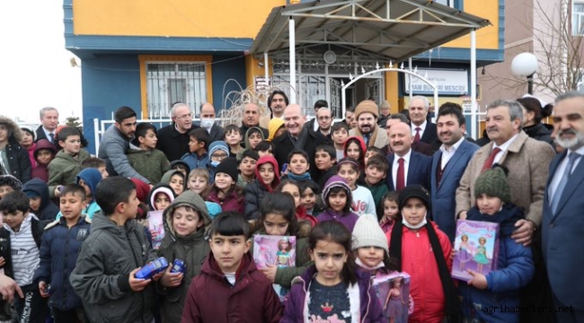 Bakan Soylu, medresenin dışında bekleyen mahalledeki çocuklara hediyeler verdi ve çocuklar ile birde hatıra fotoğrafı çekti.