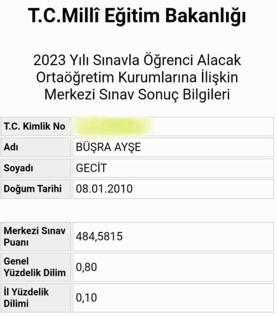Öğrencimiz Büşra Ayşe Geçit’in göstermiş olduğu başarıdan dolayı başta Geçit ailesini ve eğitim-öğretim hayatına katkı sunan tüm öğretmenlerini tebrik eder, öğrencimize eğitim-öğretim hayatında başarılarının devamını dileriz.