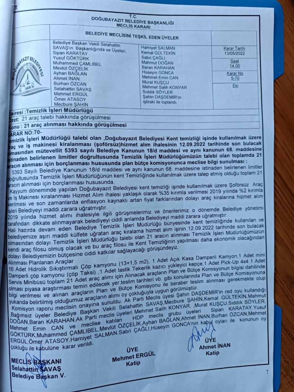 Doğubayazıt Belediyesi Temizlik İşleri Müdürlüğünün kent temizliği işinde kullanılmak üzere araç ve iş makinesi talebi olan 21 araç belediye meclisinde 21 kişi EVET oyuna karşı Şahin Daşdemir’in RET oyu ile kabul edilmiştir.