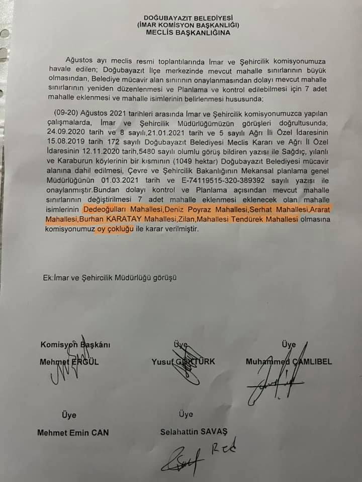 Doğubayazıt Belediyesi İmar Komisyonunun HDP’li meclis üyeleri tarafından meclise sunulan 7 mahalle ismi mecliste yapılan oylamada HDP üyeleri evet- AK Parti ve Bağımsız üyeler ret- AK Partili Mehmet Emin Can çekimser oyu kullanmıştır.