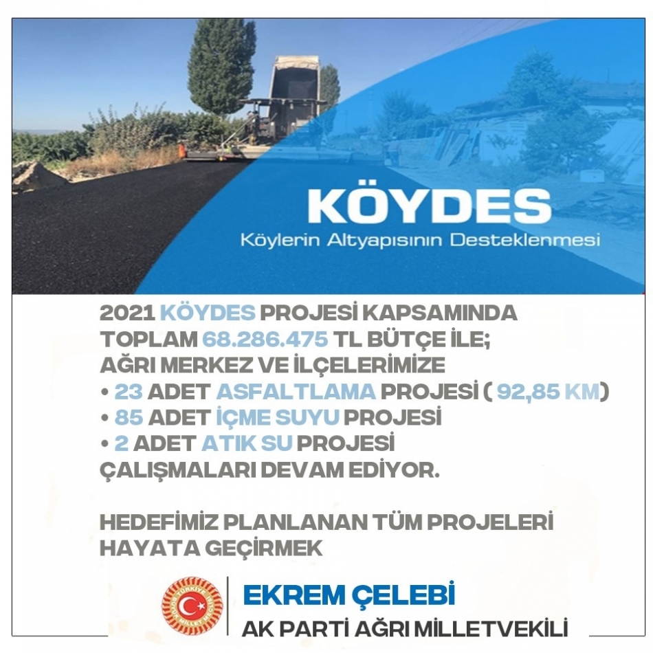 AK Parti Ağrı Milletvekili Ekrem Çelebi, sosyal medya hesabı üzerinde yaptığı açıklamasında “Ağrı Merkez ve İlçelerimize KÖYDES projesi kapsamında gönderilen 68 Milyon 286 Bin 475 TL ödenek ile