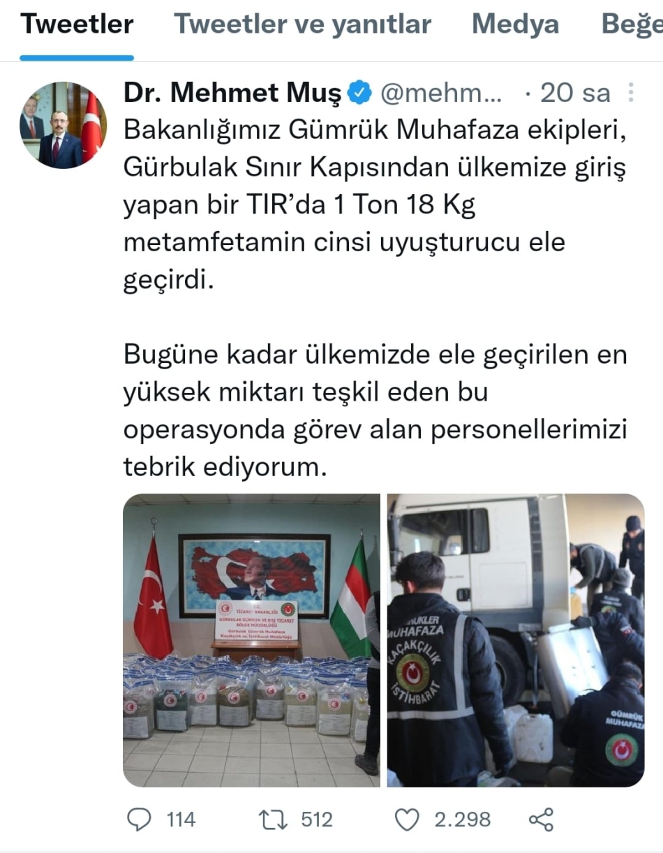 Ticaret Bakanı Mehmet Muş, Twitter hesabından yaptığı paylaşımda, "Bugüne kadar ülkemizde ele geçirilen en yüksek miktarı teşkil eden bu operasyonda görev alan personellerimizi tebrik ediyorum." ifadesini kullanmıştı.