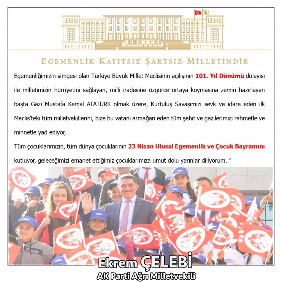 TBMM Plan ve Bütçe Komisyonu Üyesi ve AK Parti Ağrı Milletvekili Ekrem Çelebi, Türkiye Büyük Millet Meclisi’nin 101 yıldır demokrasinin kalesi olarak işlevini sürdürdüğünü belirterek, “101 yıl öncesinin aynı heyecanı, gururu ve mutluluğu içinde Türkiye Büyük Millet Meclisimizin açılışının 101. yıldönümü ve geleceğimizin teminatı çocuklarımızın 23 Nisan Ulusal Egemenlik ve Çocuk Bayramını kutluyorum” dedi.