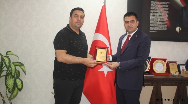 Doğubayazıt İlçe Milli Eğitim Müdürü İhsan Kösen, Doğubayazıt Ahmedi Hani Anadolu Lisesi okul müdürü Tamer Salman’a plaket takdim etti.