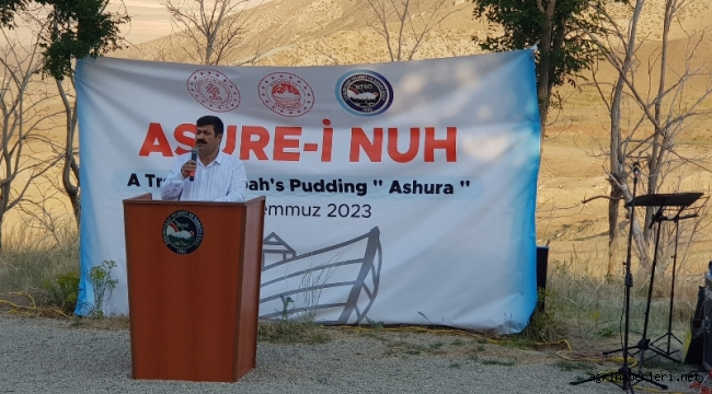 c. Gemi Ararat Dağlarına veya Cudî Dağı’na inmiştir. Durum böyle olunca, Hz. Nuh Gemisinin nerede, nasıl yapıldığı, nereden kalkıp nereye indiği hakkındaki bilgiler müstakbel zamanlarda da netleşmeyecek tarzda olduğundan sürekli olarak “incelenmeye ve konuşulmaya değer tarihi vakıa” yönünü muhafaza edecektir. Aynı şekilde Hz. Nuh Tufan’ı da bütün kültürlerde mevcut kalıntıları sayesinde insanlığın ortak bir mirası olmaya devam edecek ve dünyanın birçok yerinde sahiplenerek ortak kültür oluşturma çalışmalarına, birlik ve beraberlik çabalarına, bilimsel ve tarihsel araştırmaların artmasına, ulusal ve uluslararası akademik etkinlikler ve sempozyumların düzenlenmesine sürekli hizmet edecektir. Bu vesileyle Doğubeyazıtımızda bu önemi etkinliği düzenleyen Ticaret Odası Başkanımız Hacı Cemal Can’a, Ağrı Kültür Müdürümüz Erkan Kösedağ Bey’e, katkıda bulunan ve iştirak eden herkese selam ve saygılarımı sunar, teşekkürlerimi iletirim. İnşallah bu etkinlik her sene devam eder, Hz. Nuh’un hatırası anılır ve Doğubeyazıtımıza ait bir marka olarak “Aşure-i Nuh” ismi ulusal ve uluslararası alanda kabul edilen ve tanınan bir marka olur. Bütün bu faaliytlerimizi sürdürürken Hz. Nuh’un gönderiliş sebebi olan tevhid ve adalet davasının şu mesajını unutmayalım diyerek sözlerimi Yüca Allah’ın kelamıyla bitiriyorum: